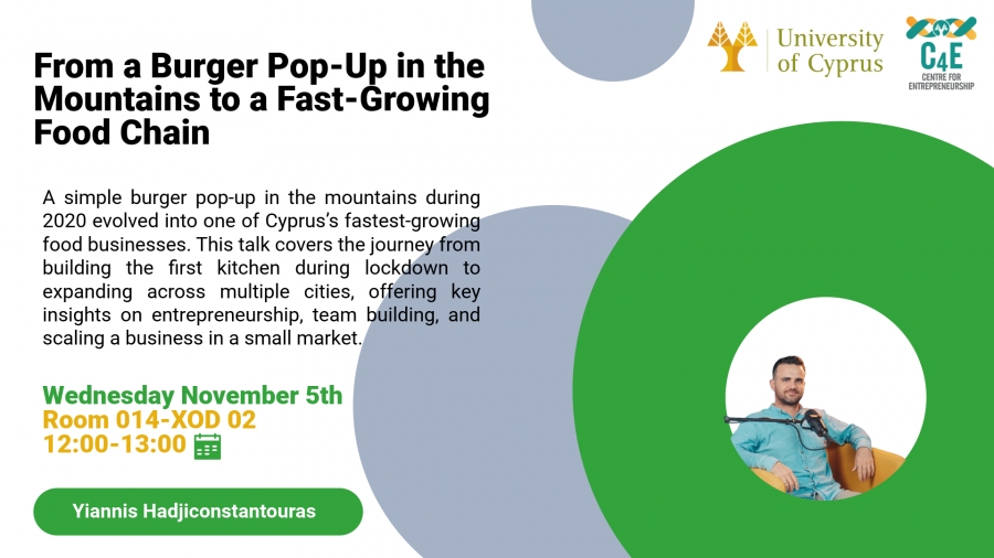 In this talk, Yiannis Hadjiconstantouras shares the journey of how a simple burger pop-up in the mountains during 2020 turned into one of Cyprus’s fastest-growing food businesses — Doorstep Multibrand Kitchens. From building the first kitchen during lockdown to expanding across multiple cities and planning international growth, Yiannis will discuss the key lessons, challenges, and decisions that shaped this journey. The presentation will offer real insights into entrepreneurship, team building, and scaling a business in a small market.